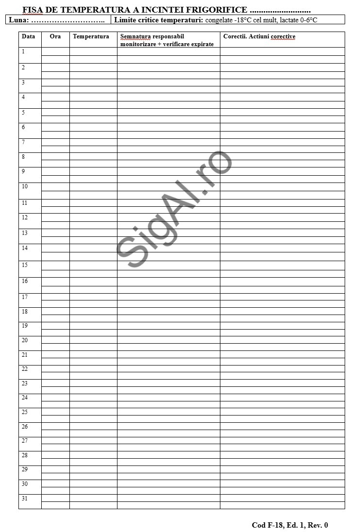 De exemplu, pentru fiecare echipament frigorific, aveți o singură pagină pentru întreaga lună, în care se notează rapid temperatura zilnică. Această abordare este perfect adaptată realității dintr-o cafenea, unde riscurile sunt mai scăzute, iar monitorizarea trebuie să fie logică și proporțională, nu birocratică.