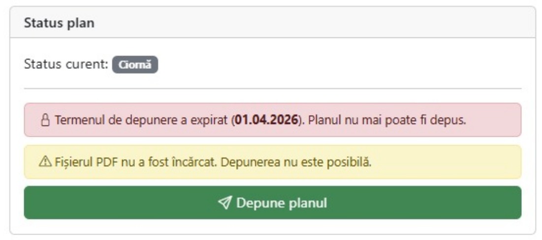 Chiar dacă termenul legal a fost 31.03.2026, iar platforma MADR este accesibilă, în acest moment sistemul afișează că termenul de depunere a expirat și că planul nu mai poate fi depus. Cu alte cuvinte, nu mai poți finaliza încărcarea planului pentru această perioadă direct în platformă după expirarea termenului.