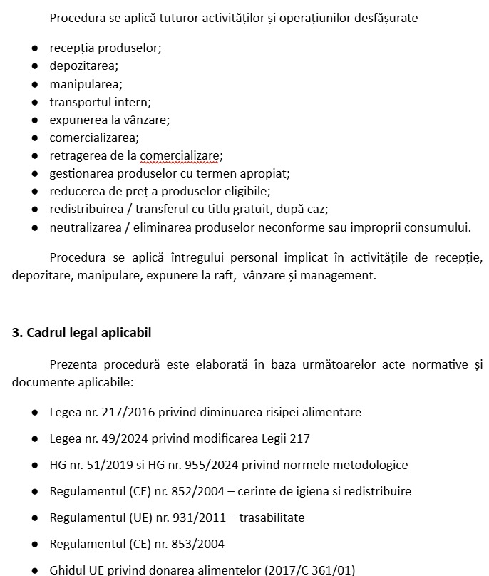 Este documentul de bază al pachetului. Procedura stabilește modul de organizare internă a măsurilor privind prevenirea și reducerea risipei alimentare în magazine și supermarketuri.