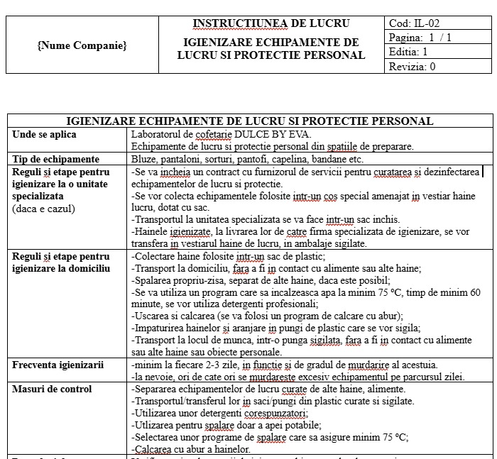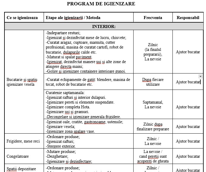- Program igienizare spatii si echipamente: contine o planificare zilnica/saptamanala cu toate spatiile si utilajele care trebuie igienizare
