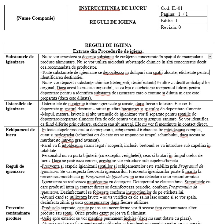 - Procedura Completă de Igienizare: Un ghid care acoperă curățarea și dezinfecția spațiilor, a echipamentelor și a ustensilelor, inclusiv frecvența recomandată.