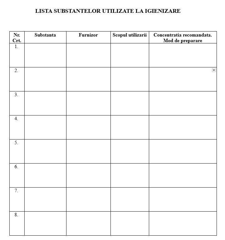 - Tabel lista substante de Igienizare (Model): O structură pentru a personaliza ce substanțe folosiți și unde le aplicați.